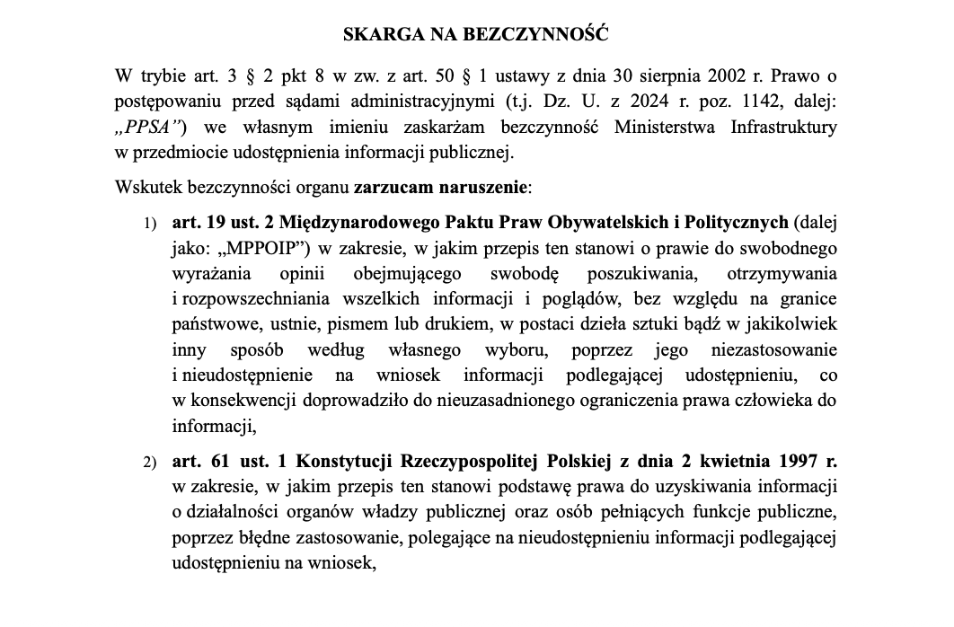 W związku z powyższym składam skargę na bezczynność Ministerstwa Infrastruktury do Wojewódzkiego Sądu Administracyjnego w Warszawie. Odpowiedź organu nie stanowi prawidłowego załatwienia wniosku. Ministerstwo nie udostępniło informacji, nie wydało decyzji administracyjnej o odmowie (do czego zobowiązuje art. 16 ust. 1 ustawy), a jedynie przekazało pismo, które de facto mija się z prawdą.