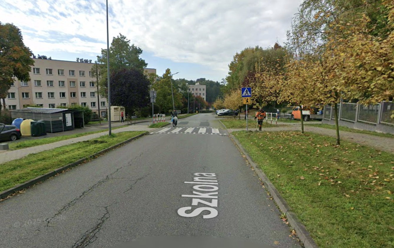 Ulica Szkolna na tym fragmencie to prosty odcinek bez zakrętów. Taka geometria drogi naturalnie sprzyja rozwijaniu wyższych prędkości. Kierowcy regularnie przekraczają limit 30 km/h, nie ustępują pierwszeństwa dzieciom na przejściach i nie dostosowują prędkości do warunków panujących w strefie szkolnej.